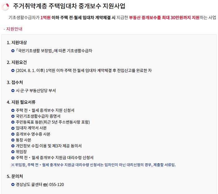 즉, 경상남도에 살면서 1억 원 이하 주택에 대한 전월세 계약을 하고 복비를 낸 기초생활수급자라면 누구나 신청할 수 있는 사업입니다.