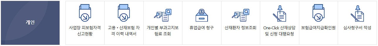 개인 | 고용·산재 이력 조회, 산재환자 정보, 보험급여지급 확인, 휴업급여 청구 |