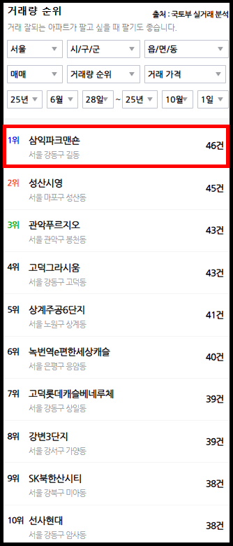 2025년 6.28~10.1 거래량: 46건 (서울 1위)