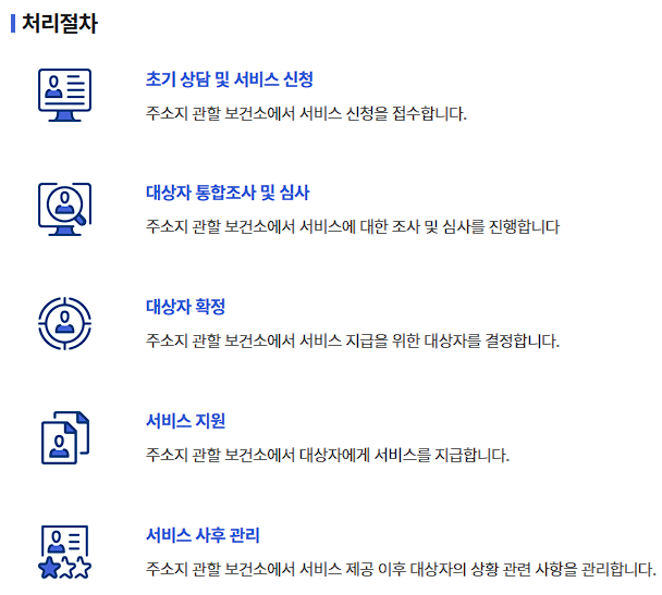 - 초기 상담 및 신청 접수 → 대상자 심사 → 서비스 확정 → 비용 지원