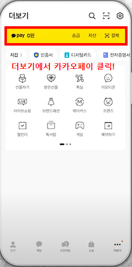 | 1단계 | 카카오톡 열기 → ‘더보기’ 탭 클릭 → ‘카카오페이’ 터치 | 카카오페이 진입 |