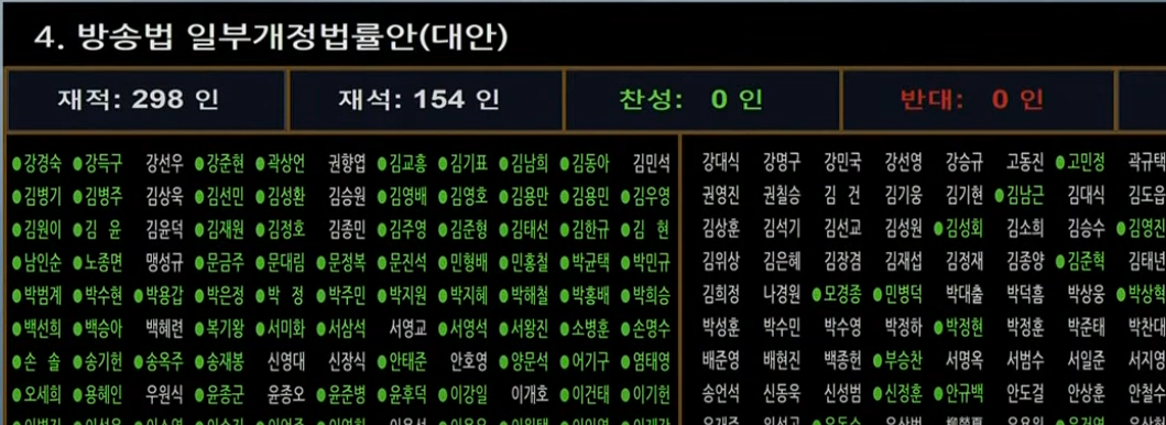 국회는 7월 임시국회 마지막 날인 8월 5일 오후 본회의를 열고, 방송법 개정안에 대해 재석 의원 180명 중 찬성 178명, 반대 2명으로 가결 처리했습니다. 국민의힘은 표결에 불참했습니다.