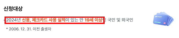 만 19세 이상(2006년 12월 31일 이전 출생)이고, 지난해 본인 명의 신용·체크카드 소비 실적이 있는