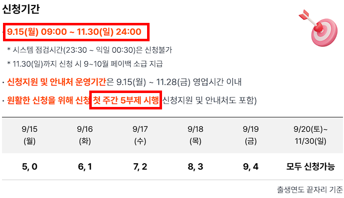 | 신청 일정 파악 | 9/15~11/30 온라인 신청, 첫 주엔 5부제 준수 |