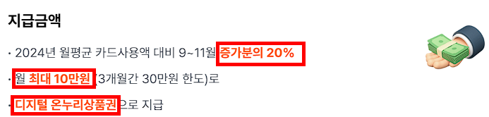 전년도 월평균 카드소비보다 9~11월 소비가 늘면 증가분의 20%를 월 최대 10만 원,