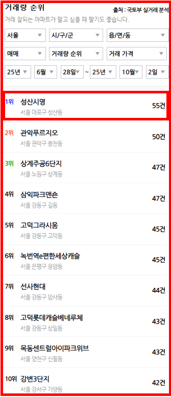 마포구 성산시영 아파트는 55건 거래로 서울 거래량 1위를 기록하였습니다.