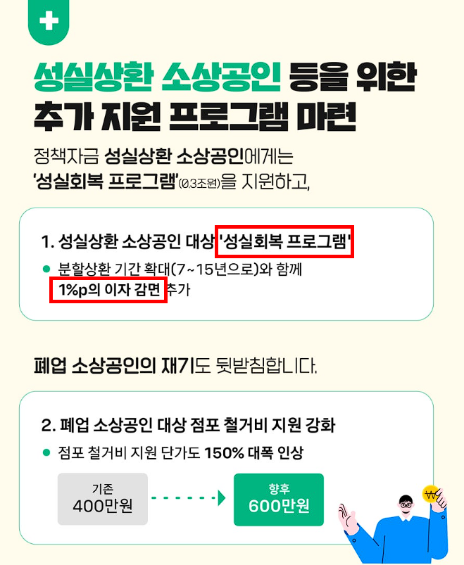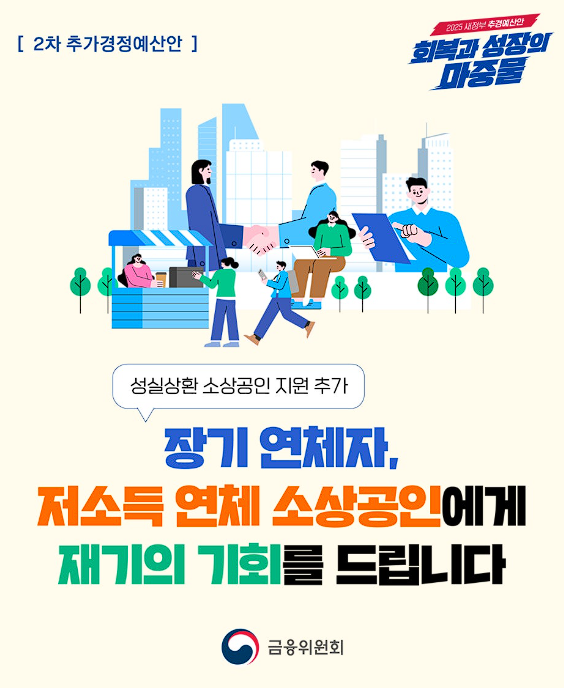 정부는 2025년 추경을 통해 정책 자금을 성실히 상환 중인 소상공인에게도이자 부담을 덜어주는 ‘성실회복프로그램’을 도입했습니다.단순 연체자 대상이 아닌 성실 상환 중인 분들에게도 혜