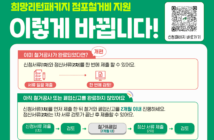 소상공인 폐업철거지원금은 단순한 비용 지원이 아닌, 재기의 디딤돌입니다. 최대 600만 원까지 확대된 이번 지원 제도를 놓치지 말고, 꼭 필요한 분들에게 전달되길 바랍니다.