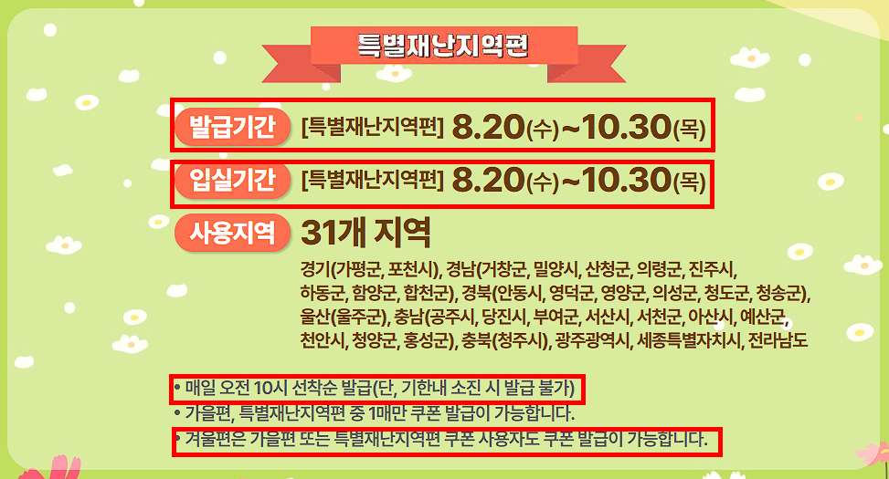 | 특별재난지역 7만 원 이상 | 5만 원 | 추가 혜택 적용 |