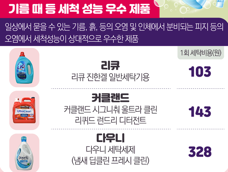 한국소비자원이 발표한 액체형 세탁세제 품질 비교 결과, 제품별로 세척 성능 차이와 세탁 비용 3배 차이가 크게 나타났습니다.
