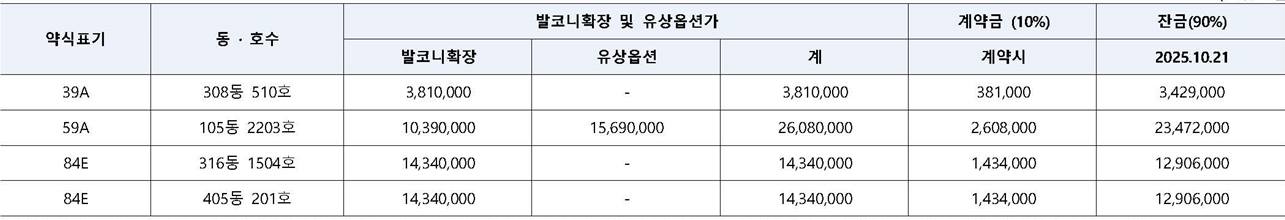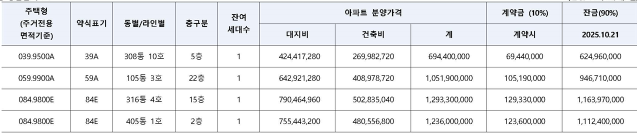 | 모델 | 분양가(계) | 계약금(10%) | 잔금(90%, 2025.10.21) |