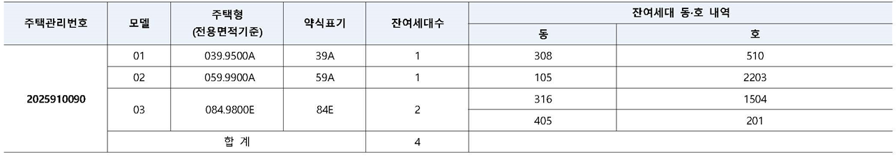 | 모델 | 전용면적 | 잔여세대수 |
