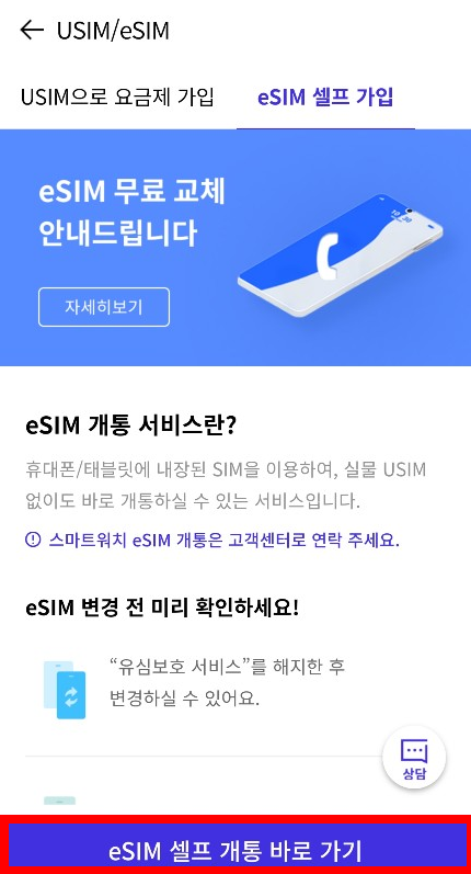 3) 'eSIM 셀프 개통 바로 가기' 를 클릭해 주세요.