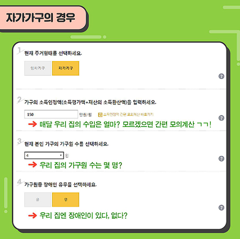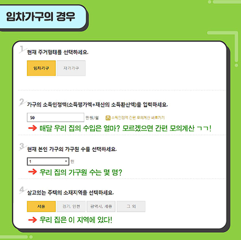 아래 리스트를 통해 주거급여 신청자격 여부를 자가진단해보세요.