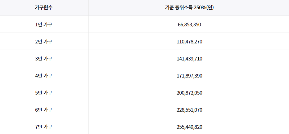 | 가구소득 | 기준 중위소득 250% 이하 |
