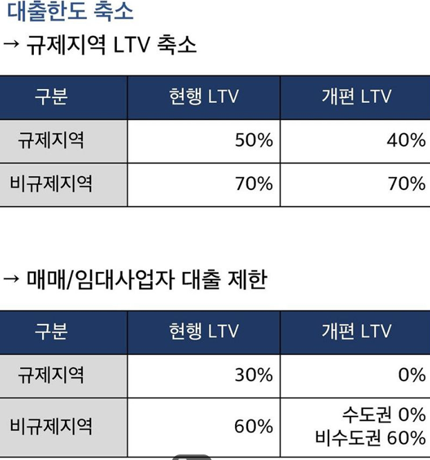 규제지역 내 무주택자·1주택자 대상 LTV는 기존 50%에서 40%로 강화되었습니다.
